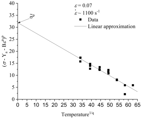 This constitutive relation assumes that the contribution of thermally activated mechanisms vanishes beyond a certain temperature. This assumption is used to identify the first three parameters , B, and n. As the stress observed for various temperatures do not evolve between 423 K and 473 K, it is assumed that for these temperatures, there is only a contribution of the athermal stress . Therefore, the results obtained at 473 K are used to identify , B, and n. The parameters and take the typical values as: p ∊ [0,1] and q ∊ [1,2]. In this work, 0.5 and 1.5 have been chosen for and , respectively as proposed by [29]. The mechanical threshold stress , then corresponds to the value added to the athermal stress in order to obtain the flow stress at 0 K. Consequently, for a fixed , the term is plotted as a function of and approximated using a linear function, Figure 9. At T = 0 K, the following equality is reached , allowing to determine , as shown in Figure 9.