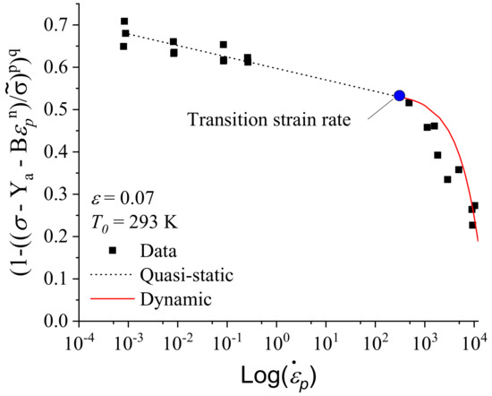 Therefore, coupling Equation (8) and Equation (9), it is possible to fit experimental results performed at room temperature for a large range of strain rates with an improved accuracy. It has to be noted that a strain rate transition in order of 102 s−1 is frequently observed for metals to describe the change between isothermal and adiabatic conditions. It induces a quick increase of the stress level with the strain rate [23,24,25]. Except for and , these three versions of the constitutive relations developed by Voyiadjis and Abed have the same parameters, as reported in Table 3.