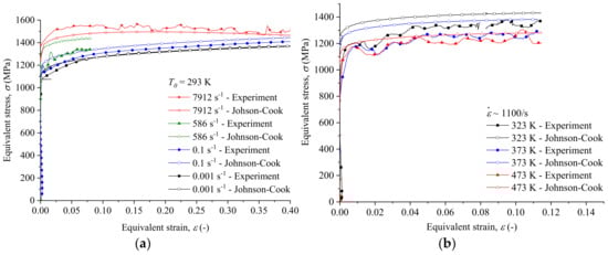 Comparison of the Johnson–Cook model and the experimental data: (a) for different strain rates, at T0 =293 K, (b) for different temperatures, at ~1100 s−1.