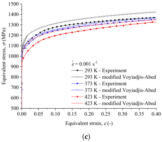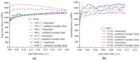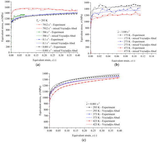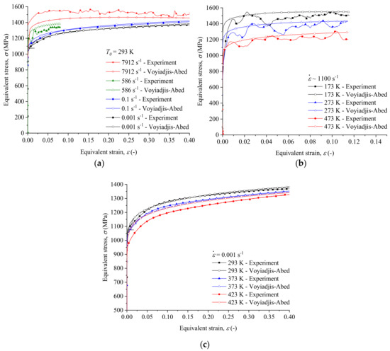 Comparison of the modified Voyiadjis–Abed model and the experimental data: (a) for different strain rates, at T0 =293 K; (b) for different temperatures, at ~1100 s−1; and (c) for different temperatures, at = 0.001 s−1.