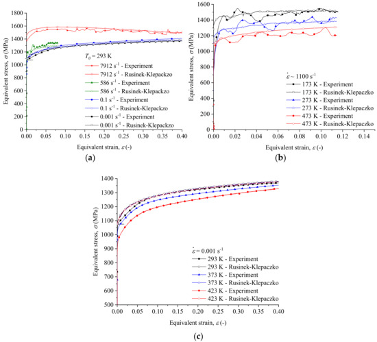 Comparison of the Rusinek–Klepaczko model and the experimental data: (a) for different strain rates, at T0 =293 K; (b) for different temperatures, at ~1100 s−1 and (c) for different temperatures, at = 0.001 s−1.