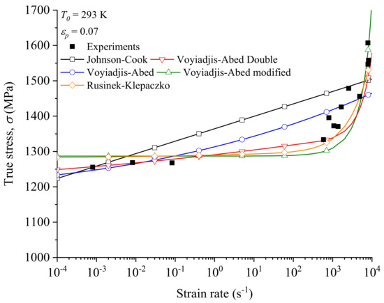 A comparison of the constitutive relations described previously is reported in Figure 17. It compares the macroscopic strain rate sensitivity described by the different models. It is observed that the Johnson–Cook model and the model defined originally by Voyiadjis and Abed do not allow to define the nonlinear strain rate sensitivity observed experimentally for metals as reported in [23,24,25]. To overcome this limitation, the model proposed by Rusinek and Klepaczko and the constitutive relation proposed by Voyiadjis and Abed (modified and using mixed approach) may be used. The three models are sensibly giving the same trends, Figure 17.
