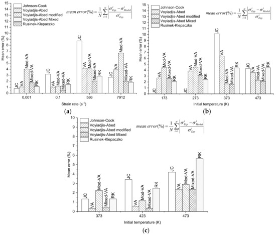 Comparison of mean error: (a) for different strain rates, at T0 =293 K; (b) for different temperatures, at ~ 1100 s−1 and (c) for different temperatures, at = 0.001 s−1.