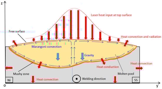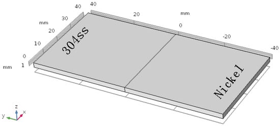 In this study, a transient, three-dimensional numerical model considering the heat transfer, fluid flow, and the free surface deformation was developed to investigate the dissimilar joint of 304ss and Ni. The schematic diagram of the dissimilar welding is presented in Figure 2.