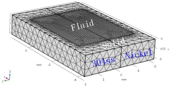 The model geometry and mesh grids for numerical simulation is shown in Figure 4. Quadratic polynomials were used for the discretization for the whole domain, and all the equations were solved by using SIMPLE solver. A fine unstructured tetrahedral mesh with maximum element size of 120 µm was applied in the fluid domain, while a tetrahedral mesh with a maximum element size of 400 µm was specified in the solid domain where only the heat conduction equation was solved. The mesh grids consist of 13,884 nodes and 79,191 domain units, with a maximum time step of 0.1 ms.