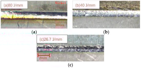Weld beads by LBW at different heat input. (a) 80 J/mm. (b) 40 J/mm. (c) 26.7 J/mm.