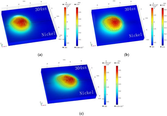 The temperature field and velocity distribution under different heat input are shown in Figure 6. Temperature field is indicated by the contour, while the velocity field is characterized by both the contour and arrows. Liquid metal is driven from the center of the molten pool towards the fusion boundary due to the negative coefficient of surface tension. The weld pool configurations on both sides are obviously different for the great difference of thermal and physical properties between 304ss and Ni. As can be seen from Figure 6a–c, the area of the top surface of the molten pool decreases with the heat input. In this study, the maximum velocity in the weld pool varies from 0.56 mm/s to 0.63 mm/s, while the maximum temperature is close to 3000 K under different settings. It can be concluded that the heat input has a relatively greater effect on the velocity than the temperature distribution in the molten pool during the welding process.
