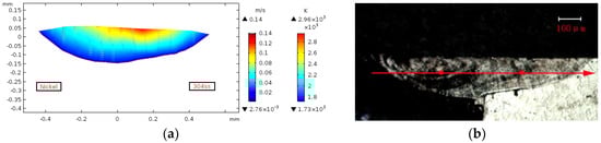 The numerical model is validated by comparing the calculated and experimentally-observed weld pool configuration under a heat input of 26.7 J/mm, as illustrated in Figure 7. The computed weld pool dimensions are reasonably consistent with the experimental results, which indicates the efficiency of the model. As can be seen from Figure 7, the weld pool depths on both sides are different. The weld pool penetration of the 304ss side is smaller. Because the convection in the 304ss side is more pronounced [] and the surface tension temperature coefficient is negative, the intense outward flow is induced by the surface tension (Figure 6), and the molten pool on the 304ss side is shallower compared with that at the Ni side. In this study, the free surface deformation at the gas-liquid interface is captured by the moving mesh method based on the Arbitrary Lagrange Eulerian [], as shown in Figure 7a. It is also illustrated in Figure 7a that the velocity at the top area of the melt pool is faster in the joint of 304ss and Ni, since the fluid flow is mainly driven by the surface tension acting on the free surface.
