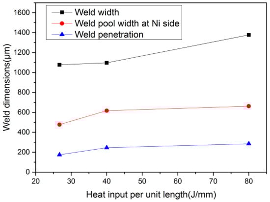 The weld dimensions under different heat input are shown in Figure 8. Both the weld depth and the weld width increase with the heat input. When the welding speed changes from 10 mm/s to 20 mm/s, the change of the weld width is much larger than that from 20 mm/s to 30 mm/s, because the change of heat input per unit length from 10 mm/s to 20 mm/s is obviously larger. It is also demonstrated that the heat input per unit length is more effective to characterize the effect of heat input on the weld dimensions compared with welding speed. The weld pool on both sides shows great differences during the dissimilar welding of 304ss and Ni. In the previous discussion, the difference in the weld pool penetration has been studied. As shown in Figure 8, the weld width changes with the heat input, but the weld pool width at Ni side is generally half of the whole weld width at different heat input. This is because the difference between the melting point of 304ss and Ni is small, i.e., 1727 K and 1735 K, respectively. Under the action of symmetrical Gaussian laser beam, the weld width on both sides tends to be equal.