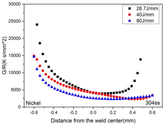 The effect of solidification parameters G/R and cooling rate GR on the solidified microstructure is shown in Figure 9. Parameter G/R affects the morphology of the structure and smaller G/R tends to produce equiaxed grains. The cooling rate GR affects the scale of the solidified structure; a larger GR has a higher tendency to produce finer solidified structure in the fusion zone. Figure 10 shows the spatial distribution of the parameter G/R at different heat input, and all the values are calculated along a horizontal line 0.1 mm below the weld surface, as shown in Figure 7b. The G/R gradually increases from the center to the edge on both sides, and the G/R at Ni side is larger than that at 304ss side, which indicates that equaixed grains are more likely to be produced near the weld center. The G/R for case 3 is the largest, followed by case 2 and case 1, but the difference of G/R between two different heat input is relatively small. The spatial distribution of the cooling rate GR at different heat input is shown in Figure 11, and the effect of heat input on GR is obviously observed. With a decrease of heat input from 80 J/mm to 40 J/mm to 26.7 J/mm, the cooling rate at the weld center changes from 2280 K/s to 12,976 K/s and 13,231 K/s, respectively. It can also be seen from Figure 11 that the GR decreases gradually from the center to the edge of the melt pool. The GR increases with the welding speed, but the change of GR from case 1 to case 2 is greater because the change of heat input per unit length in this situation is larger, as previously discussed. Therefore, it can be predicted that the solidification structure for case 3 is the finest, and the morphology of the solidified structure at different heat input in this study tends to be consistent, which will be verified by the experimental results in the next discussion.