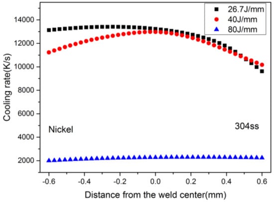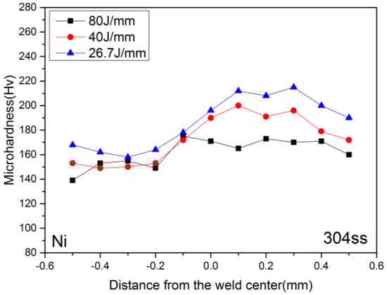 Microhardness was measured along a horizontal line below the weld surface (the red line in Figure 7b). The Vickers hardness of the solidified structure at different heat input is obtained, as shown in Figure 14. The microhardness of 304ss and Ni base metal is 210 Hv and 160 Hv, respectively. It can be seen that the hardness at the heat input of 26.7 J/mm is the largest, followed by the hardness at the heat input of 40 J/mm and 80 J/mm. For the case of 26.7 J/mm, the cooling rate is the largest, as shown in Figure 11, and the corresponding structure is the finest, as illustrated in Figure 12; therefore, the hardness is the highest. The cooling rate at the heat input of 40 J/mm is larger and the grain dimension is finer compared with that at the heat input of 80 J/mm; thus, the microhardness is bigger. The variation of Vickers hardness is consistent with the variation of the cooling rate and the grain dimension in the fusion zone. The hardness increases gradually from nickel side to 304ss side because the hardness of 304ss base metal is higher than that of nickel. The formation of brittle of intermetallic compounds (IMCs) at the weld seam may also affect the microhardness, which would be considered in future study.