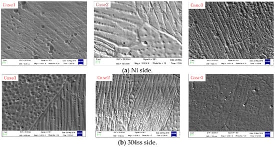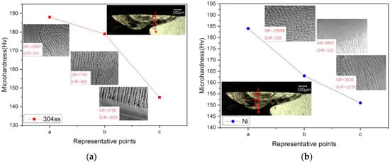 Figure 12 shows the solidified structure at different heat input, which is observed in the area around the representative points illustrated in Figure 7b. As mentioned above, the value of the parameter G/R under different heat input is close, while the cooling rate (GR) shows great difference, and the value for case 3 is the largest, followed by case 2 and case 1. As shown in Figure 12, the change of heat input in this study has no effect on the morphology of the solidified structure, and the morphology of the solidified structure under different cases is similar. However, the heat input has a great influence on the scale of the solidification structure, as illustrated in Figure 12. It can be seen that a solidified structure for case 3 is the finest, and finer for case 2 than for case 1. The lower the heat input, the larger the cooling rate, and the finer the solidification structure. The experimental observations are consistent with the predictions form the solidification parameters shown in Figure 10 and Figure 11. Therefore, it can be concluded that the heat input has a greater influence on the scale of the solidification structure than the morphology of the microstructure. Finer solidification structure could be obtained by decreasing the heat input during the dissimilar laser welding of 304ss and nickel. The microstructure dimensions are important for the control of the welding quality, and finer grains usually result in better mechanical properties []. For example, the microhardness of the finer solidification structure is higher than that of the coarse structure, and higher microhardness shows good wear performance. Therefore, the mechanisms of the correlations between heat input, solidification parameters, solidified structure, and mechanical properties are studied to obtain finer structures and better mechanical performance.
