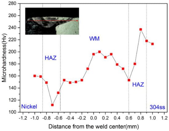 The microhardness of the joint of 304ss and Ni at the heat input of 40 J/mm is shown in Figure 15. The hardness of the fusion zone is higher than Ni but lower than 304ss base metal. The hardness of the heat-affected zone (HAZ) at Ni side is lower than that of the base metal, which is attributed to the coarse grains introduced by the solid phase transformation []. In the HAZ of the 304ss side, hardening occurs due to the self-quenching effect, and the hardness is higher than that of the base metal.