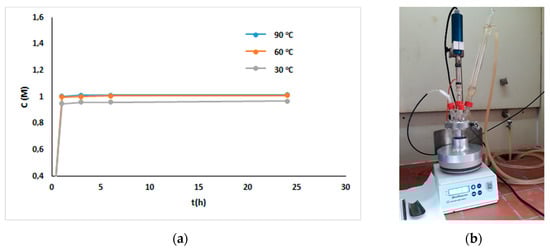 Rare earth metals are known to form strong complexes with halide anions, rendering their dissolution a challenging task [,]. The halide salts in non-aqueous electrolytes present great interest for electrorecovery applications, because they are oxidized at mild anodic potentials prior to the oxidation of the electrolyte, thus preventing its anodic decomposition. The first point that had to be elucidated in the system under consideration was the dissolution of the halide salt in the organic solvent chosen as the electrolytic medium. It was decided to investigate the dissolution of NdCl3 in DMSO. The dissolution experiments were performed in a mini-reactor of working volume V = 60 mL, under continuous argon purging, stirring set at 300 rpm for a total duration of 24 h. The amount of NdCl3 added to the mini-reactor was determined to be equal to the quantity needed to form a solution of 1 M Nd concentration, if total dissolution occurred. The experiments were performed for three selected temperatures (30 °C, 60 °C, and 90 °C) and samples were collected after the 1st, 3rd, and 6th hours and at the end of the experiment in order to be analyzed by ICP-OES and to measure Nd concentration in the solution. The chemical analyses performed showed that by the first hour almost the total amount of Nd added in DMSO has been dissolved (Figure 1). The concentration of Nd was stable after 3 h. Nd concentration in the final solution produced at 90 °C and 60 °C was 1 M, while it was slightly lower for the solution produced at 30 °C (0.96 M).