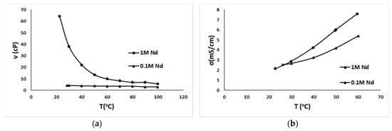 The conductivity and the viscosity of the solutions produced after the dissolution experiments were studied at various temperatures. Figure 2a presents the results for the viscosity measurements performed for the solutions that were previously produced and for a dilute solution of 0.1 M Nd. It was revealed that the more concentrated solutions present higher viscosity. The solution with 1 M Nd, as it was anticipated, presented significant viscosity, while the dilute solution of 0.1 M Nd at room temperature was almost 16 times less viscous than the concentrated one. It is estimated that the higher Nd concentration leads to the complexation of Nd with the solvent’s molecules and the subsequent formation of chemical species that contribute to the increase of the viscosity of the system under study. As the temperature is increased, however, the viscosity of 1 M Nd solution is drastically decreased, and at temperatures higher than 80 °C it is almost comparable with the viscosity of the dilute solution of 0.1 M Nd. The increase of temperature affects, mainly, the concentrated solution and not the dilute one, since for the latter the viscosity at room temperature is already substantially low and it cannot be drastically further decreased. On the other hand, the conductivity measurements that were realized for the concentrated solution (1 M) and the dilute one (0.1 M) and are presented in Figure 2b, demonstrate that at room temperature the conductivity of the two solutions is comparable. Nevertheless, as the temperature is increased above 30 °C, the more concentrated solutions exhibit higher conductivity in comparison to the dilute solution. Apparently, higher conductivity is due to the higher amount of charged species present in the solution. The increase of temperature has, as a result, the consequent decrease of system’s viscosity, as it was reported previously, and, therefore, the charged species present higher mobility. Since the concentrated solutions are present in higher amounts, they lead to the increase of the system’s conductivity.