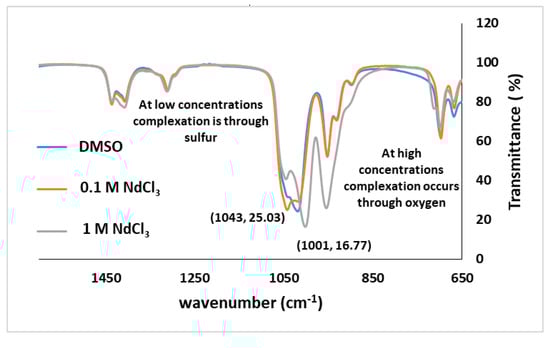 It is strongly recognized that the complexation of cations in a solution plays an important role in the properties and characteristics of a potential electrolyte [,]. The next step of the study was to determine the state of Nd in the prepared solutions by Infra-Red spectroscopy. The Infra-Red spectra were collected in the range of 4000 to 650 cm−1. The spectra are presented in Figure 3 for the pure DMSO, 0.1 M NdCl3 in DMSO, and 1 M NdCl3 in DMSO. Dimethyl sulfoxide has a sulfonyl group and the normal absorption of the S=O bond occurs at 1050 cm−1 [,], as confirmed in Figure 3. Metals can bond to DMSO either through its oxygen or its sulfur [,]. If the bonding is to the sulfur, the metal donates electrons from its π orbitals into an empty π orbital on the DMSO ligand, thereby increasing the S–O bond order. Thus, if the metal is bonded to the DMSO at the sulfur, the frequency of the S=O absorption increases. If the bonding is to the oxygen of the DMSO, the metal forms a bond with one of the lone pairs on the oxygen and thereby withdraws electron density from the oxygen []. Therefore, the S=O bond order declines and the S=O absorption appears at a lower frequency.