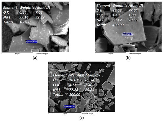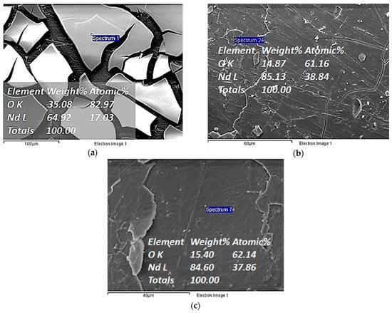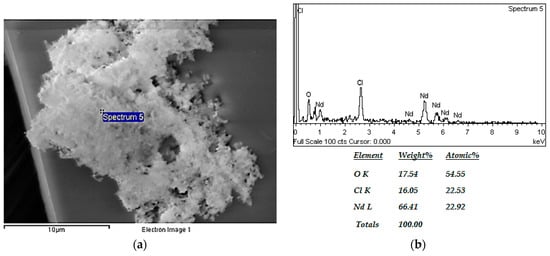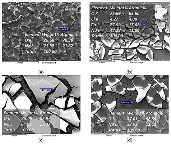 Larger electrodeposits were found for the more concentrated solutions as is presented in Table 2. The SEM-EDS analysis confirmed the presence of Nd and O due to the oxidation of the metal when in contact with the air (Figure 7).