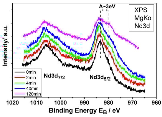 X-ray Photoelectron Spectroscopy (XPS) core level spectra of Nd3d of the electrodeposit after introduction in UHV before and after Ar+ sputtering for 2 min, 4 min, 40 min, and 120 min.