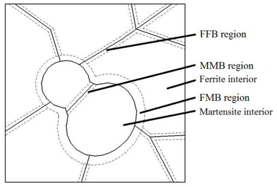 To understand the micro-mechanical behavior better, there existed some models divided the microstructures into several regions with different mechanical properties. The ferrite matrix was divided into two regions considering with the boundaries hardening to predict the material flow stress [31]. The stress of ferrite phase, ferrite-martensite boundary (FMB) layer and martensite phase have been defined to predict the overall stress-strain curve considering the GNDs effects [32]. The intermediate layer with GND density has been inserted between the matrix and the particles to study the mechanical properties [33,34]. The properties of the region between ferrite and martensite phases has been studied by setting up an independent region between ferrite and martensite with different phase boundary layers [34,35].