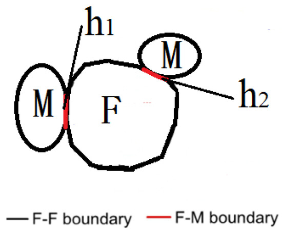 The microstructures of the DP steel were captured by an optical microscope (Shanghai Wanheng Precision Instruments Co., Ltd., Shanghai, China) during the tensile experiment. To predict the stress of the individual phases precisely, grain diameter di, grain shape parameter Si, and martensite relative grain-boundary coverage ratio are added to the dislocation-based model. The martensite relative grain-boundary percentage is the ratio of FMB length to the corresponding total ferrite boundary length. The sketch of relative grain-boundary coverage is shown in Figure 5.