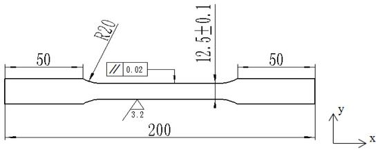 DP600 is a typical multi-phase high strength steels and was applied to validate the proposed theoretical model in this paper. The geometry of the DP600 specimen is shown in Figure 6 and the thickness is 0.9 mm. The uniaxial tensile testing was performed using MTS universal test systems. Three specimens were tested and the macro-mechanical properties of the DP600 steel were obtained as shown in Table 1. The chemical composition of the DP600 steel was determined by inductive coupled plasma emission spectrometer (ICP) (Thermo Scientific, iCAP6300, Waltham, MA, USA). Three samples were tested to reduce the random errors and the results are shown in Table 2.
