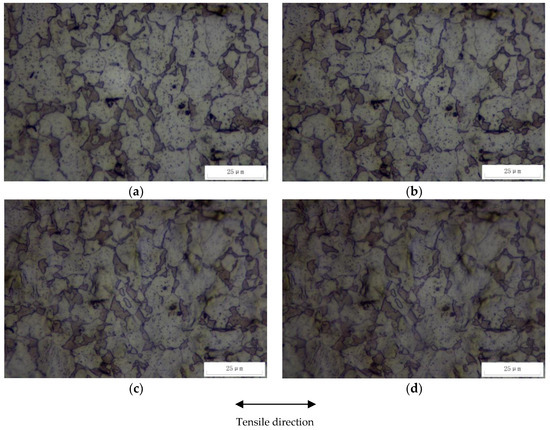 Metallographic figures of the sample are shown in Figure 7 with different strain value. The ferrite grain size has obvious changed, especially along the stretching direction. The two-dimensional deformation field was obtained by using the PIM calculation. The strain of individual phases and material overall strain are calculated by the relational expressions of Equations (3) and (4). The fitting parameters , are obtained by experimental study and the average value are shown in Table 3.