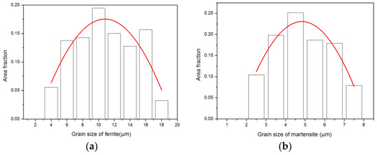 The grain size distribution of individual phases was counted based on the metallographic analysis and shown in Figure 8. The grain size distribution is a unimodal curve. The grain shape factor of individual phases was calculated, which is mainly between 1.5 and 1.7. Taken the influence of grain volume into account, the volume-weight average grain shape coefficients of both phases were calculated by the Equation (30). The FMB percent for ferrite phase is mainly between 0.65 to 0.8, while the FMB parameter for martensite phase is 0.85–0.99. It can be deduced that the martensite phase almost be enclosed by ferrite phase totally and MMB only take a tiny percentage for martensite particle.