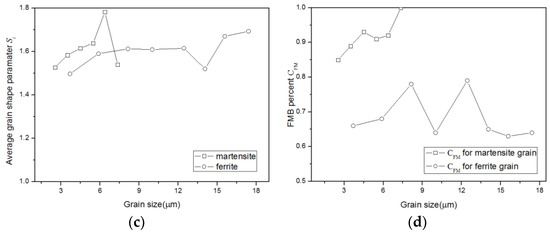 Distribution of the grain characteristic, (a) grain size of ferrite, (b) grain size of martensite, (c) average grain shape parameter Si, and (d) FMB percent CFM.