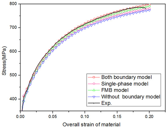 The flow stress-strain curves of the different models were calculated and are shown in Figure 9. The plastic stress of the single-phase hardening model is larger than the stress of FMB hardening model at initial deformation stage, while the stress of single-phase hardening model became small with the increasing strain. This is due to plastic deformation starts in FFB interface region earlier than the FMB interface region. In addition, the stress in the FMB interface region is larger than the FFB interface region in large strain. The proposed model with both boundary effects can predict the experimental stress-strain respond more precisely than those models without considering the both boundary effects.