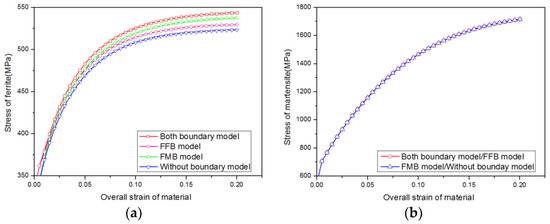 The stress change laws of both phases with different models are shown in Figure 11. The ferrite stress of single-phase model is larger than the stress of FMB model at small strain, while it has an opposite result at large strain. This is due to ferrite phase occurred plastic deformation in the early stage and the dislocations stored at grain boundaries, which act as an effective barrier, resulting in the ferrite stress of single-phase model increased. The GBDs accumulate and saturate along the ferrite grain boundaries then pass through the FFB. With the GBD density decrease to a certain value, the FFB hardening stress goes to a stable value in large strain. The plastic deformation appears in the vicinity FMB relatively later and then the dislocation density is larger than the value in FFB region gradually. The stress of FMB model is larger than the single-phase model at large strain. It explains the stress changing law of single-phase model and FMB model. The martensite stress of the both boundary model and the single-phase model are same. The FMB model and the model without boundary effects have the same martensite stress as shown in Figure 11b. The martensite stress of all the models have hardly difference, because the MMB in martensite boundary only takes a very small proportion. In large plastic deformation, the stress decrease in the order: MMB region, martensite interior region, FMB region, FFB region, and ferrite interior region.