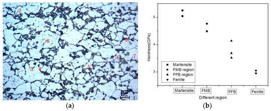 Based on the nano indentation experiment, some indentation points and the corresponding hardness value are shown in Figure 12. The hardness value of martensite interior region, FMB region, FFB region and the ferrite interior region decrease gradually. Hardness values of different regions rely on their respective carbon contents and dislocation densities [50]. For the ferrite phase, the different regions usually have the varies carbon contents, and the carbon content in boundary region is higher than the inner region. Thus, the large hardness value location in region ferrite corresponds to a high dislocation densities and large stress. This is in line with the assumption and conclusion of the proposed multi-regions model. The nanoindentation tests verified the reasonability of the proposed model.
