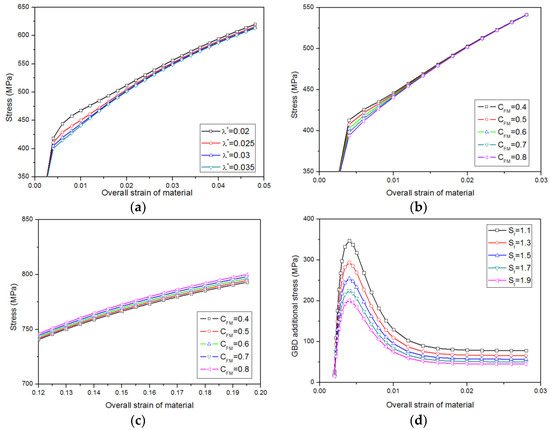 The effect of ferrite grain shape coefficient on the additional stress of FFB region is shown in Figure 13d. The additional stress increases until to a limit value and then decreases to a stable value gradually. This is due to grain boundaries are treated as obstacles for dislocations up to reaching a critical stress, then the new dislocations pass through the boundary [42]. The small grain shape parameter Sf has a large additional stress. This is due to smaller grain shape parameter Sf has a relatively shorter grain boundary for the same diameter grains. The short grain boundary leads to the dislocations accumulation more concentration and yields higher dislocation density, which results in a larger additional stress in the FFB region.