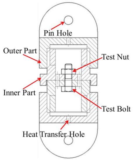 The fixture device consists of inner parts and outer parts, connected by threads, and its specification is M48 × 5 (The nominal diameter is 48 mm and the pitch is 5 mm). The material of all of the parts in the test fixture device is GH4169, which is the same material as the bolt. The inner parts are clamped by the test bolt and nut, and the outer parts are connected to the fatigue machine by cylindrical pins. The assembly diagram of the fixture device is shown in Figure 1, and two bolt holes with a diameter of 8.5 mm are opened in each inner part, respectively. On the other hand, in order to ensure the efficient heat diffusion between the high-temperature furnace of fatigue machine and interior space of the fixture device, two small holes were made in each inner part, which can be seen in Figure 1.