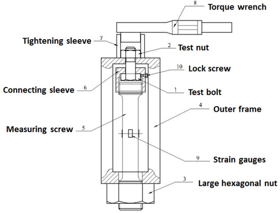 In the process of pre-tightening, the relationship between torque and preload is expressed by , where is input torque, is achieved preload, is the nominal diameter of the thread, and is the torque coefficient [27]. The torque coefficient is dependent on the friction coefficients and thread geometry parameters including the nominal diameter of the bolt, friction angle, helix angle, etc. As the thread geometric parameters have been determined for the test bolts, the friction coefficient becomes the dominant factor affecting the nut factor. In order to obtain the value of , a new measuring device is designed to measure the initial preload that is achieved in the bolt during the pre-tightening process as shown in Figure 2 [28]. The measuring device consists of the electric torque wrench, tightening sleeve, outer frame, measuring screw, connecting sleeve, strain gauges, large hexagonal nut, lock screw, test bolt, and nut. Except for the wrench, tightening sleeve, and lock screw, the other parts are made of nickel-based superalloys GH4169. In this device, four strain gauges are pasted evenly on the circular surface at the middle of the measuring sleeve. The stress distribution in the middle cross-sectional area of the measuring sleeve is uniform, and the tension (it is equal to the initial preload that is achieved in the bolt) can be calculated through axial strain that is measured by strain gauges. That is , where is young’s modulus, is the average value of four strains that are measured at the middle of the measuring sleeve, and is the cross-section area.