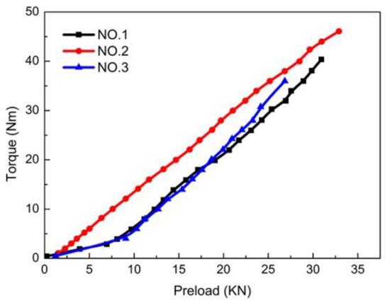 Three test bolts are used to conduct the pre-tightening experiments (Shaanxi Dongfang Aviation Instrument Co., Ltd., Hanzhong, China) in this paper. In the pre-tightening process, the bolt is stretched and the axial preload of the bolt is equal to the tension of the measuring screw (), and the torque that is applied can be obtained directly by the electric torque wrench. As a result, the relationship curves of torque versus initial preload achieved are plotted in Figure 3.