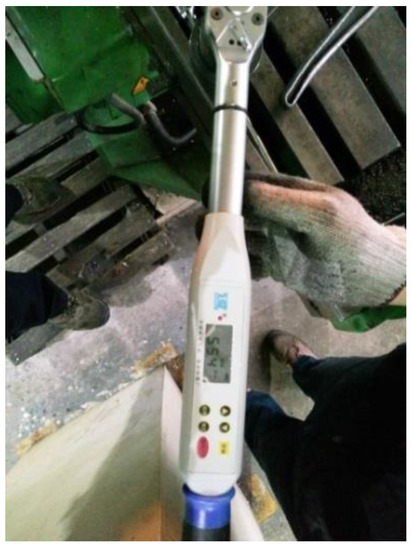 The nuts used in this paper are lock nut, and there is a prevailing torque existing in the lock nut. Further, the value of the prevailing torque is 12.5 Nm, which is measured by the digital wrench. The value of the torque coefficient of the bolts that were used in the fatigue test was 0.183, which was obtained by fitting relation curves between the torque and preload. The bolt should be pre-tightened before the fatigue test. The torque-only control method was used to apply preload to the test bolt through torque wrench, and the target value of preload was 30 kN according to the above analysis. The pre-tightening process is shown in Figure 4, and corresponding parameters are listed in Table 2.