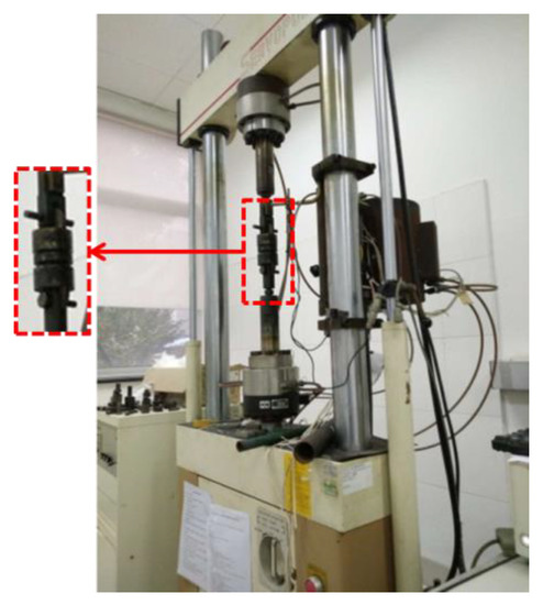 After the installation of the test fixture with the test bolt and nut, the whole device was connected to the fatigue machine (Shimadzu Corporation, Kyoto, Japan) by cylindrical pins, as shown in Figure 5.