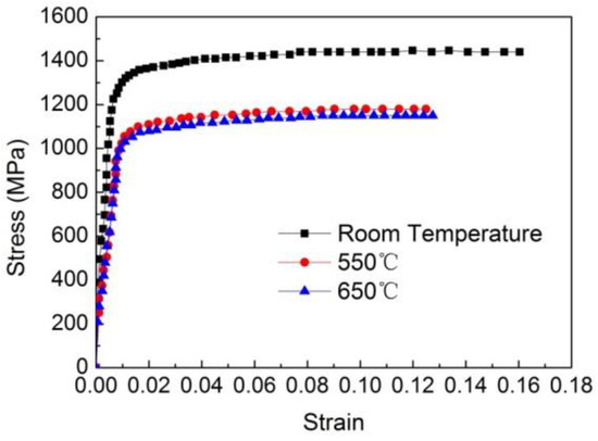 The stress at the root of the threads (especially at the first engaged thread root) will exceed the yield limit of the material because of the serious stress concentration. Therefore, elastic-plastic behavior should be considered when analyzing the stress and strain distributions of the structure. The stress-strain curves of GH4169 at the temperature of 550 °C, 650 °C, and room temperature are shown in Figure 8.