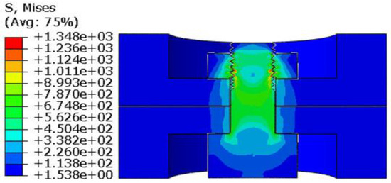 It can be seen from Figure 9 and Figure 10 that both the maximum Von Mises stress and the maximum principal strain are located at the root of the first engaged thread between the bolt and nut. The maximum Von Mises stress is 1348 MPa, and the maximum principal strain is 1.945 × 10−2. Therefore, the emphasis should be placed on the analysis of the stress and strain state of the thread portion.