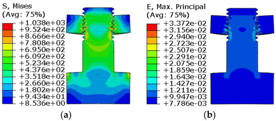 Von Mises equivalent stress and the maximum principal strain contours of the bolt and nut under the action of the maximum tension for condition 1: (a) Von Mises equivalent stress; (b) maximum principal strain.