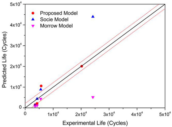 It can be seen from Figure 14 that life prediction with the proposed fatigue model agrees better with the experimental results for all of the conditions, and the prediction errors are basically within a factor of 2.5. On the other hand, the fatigue life predicted through the Morrow model and Socie model is far away from the test data for condition 1, although it can get relatively accurate results for other conditions.