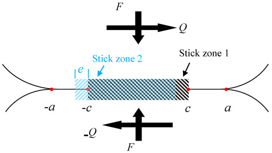 To illustrate the effects of tangential loading a modified formulation is required [50,51]. Near the contact edge, , this is the slip zone and there will be relative sliding between the contact interfaces. Therefore, we can express the shear traction as . Whereas, near the contact centre, , there is a centrally symmetrical stick zone (indicated as stick zone 1 in Figure 2), which means that the contact surfaces will move together. So that in this zone the shear traction does not reach the critical value .