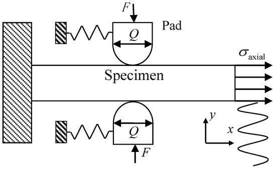 From Figure 4, we can see the experimental setup by a schematic view [53] for contact of two cylindrical pads and a flat specimen. Under the action of normal load F, the two fretting pads maintain the contact. In addition, the coefficient of friction between the contact surfaces is 0.65 [53]. The cyclic axial load is acting on the right side of the specimen. Two springs are attached to the fretting pad, which will generate the tangential load Q, under the combined effect of these loads, so that fretting fatigue will occur around the contact area.