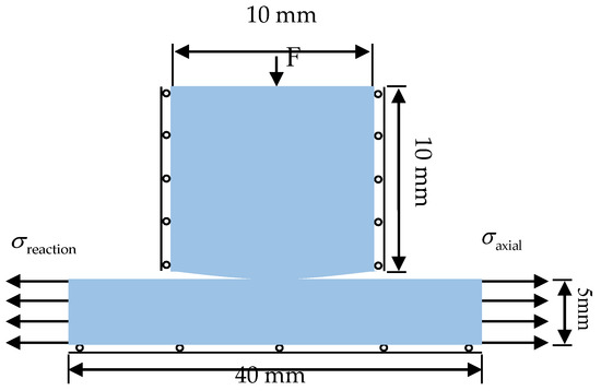 The radius of the pad and width of the specimen are taken from [53]. As shown in Figure 5, the length of the specimen is 40 mm and the width is equal to 5 mm. In addition, the thickness of two bodies and the radius of the cylindrical pad are 4 mm and 50 mm, respectively. At the top surface of the cylindrical pad, a normal load is applied. The pad is restrained from both sides in the x-direction. On the right hand-side and left hand-side of the specimen, an axial stress and a reaction stress are applied, respectively. The value of is given by [54]: