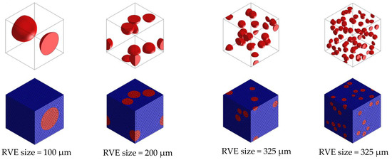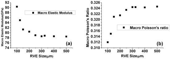 This case has the strongest inclusions, and the convergence of RVE size is studied for it. Four different kinds and sizes of RVEs and corresponding mesh models are shown in Figure 7. For the convergence study nine different sizes have been calculated and the corresponding macro material properties are shown in Figure 8. When the RVE size reaches 325 μm, the macro elastic modulus remains around 78.84 GPa, Poisson’s ratio will be around 0.32 and the relative difference from adjacent results is less than 1%. Therefore, the converged RVE size of this case is 325 μm and it can be applied to all other cases. In order to be safe, each case has been calculated three times, and then the average of the results is taken. In this way, we can get the macroscopic material properties of a specific heterogeneous aluminum alloy.