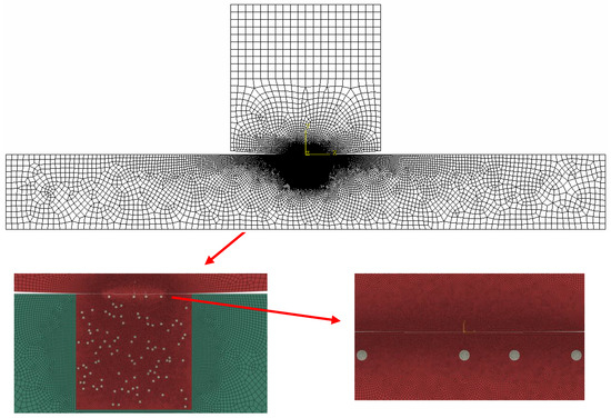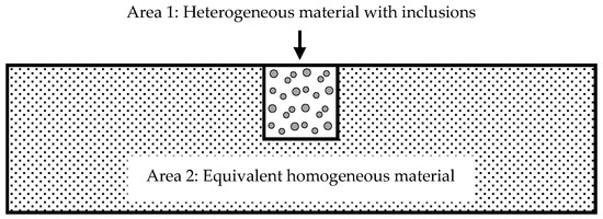 As the contact width for all load cases in the experiment [53] is 0.47 mm. A 2 mm × 2 mm rectangle is chosen in Area 1 in Figure 9. The numerical study in this paper is divided into two parts. The first part is the simulation of the nine inclusion-structures in Table 2, which have completely randomly distributed inclusions. For the second part, since the inclusion locations of each case are randomly generated, each case cannot have the same inclusion order. This makes it impossible to use the control variable method to explore the effect of the shape, size and position of the inclusions on the contact stress distribution. Therefore, we artificially placed four inclusions below the sample contact area to compare the effects of different inclusions on the surface stress distribution. These inclusions vary in size, shape, and material corresponding to different cases. Figure 11 shows a completed finite element model, corresponding to case 3 in Table 2.