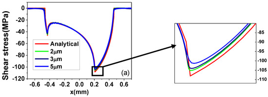 After that, a parametric 2D finite element model is created in ABAQUS [64] using Python script. A higher-order element always causes an instability in the stress value on the contact surfaces [65]. Therefore, we chose the CPE4R element (plane strain element, 2D, four nodes) instead of eight-node elements to mesh both parts. As shown in Figure 3, the stress distribution in the contact region is very complicated and stress amplitude is large. In particular, near the border between slip and stick zone, it changes very rapidly. In order to get precisely the stress distribution and contact stresses, the model is refined near the region of contact and inclusions. The boundary and loading conditions are as described at the beginning of this section. The contact behavior is described by the master-slave algorithm. A Lagrange multiplier is used to establish the contact between the pad and the specimen. The other contact methods can also be applied as shown by other researchers [66]. The slave surface is defined on the top surface of the specimen and the master surface is defined on the bottom surface of the pad. For homogeneous material, the stress distribution at the contact interface can be obtained analytically, if the assumptions of the Hertz solution are met. The most important two assumptions are: (a) pure elasticity and (b) the size of the contact area is small enough relative to both contact bodies. The first assumption is met as only linear elasticity is considered in this study. The second one is also called the half-space assumption [52]. The contact width for all load cases in the experiment [53] is 0.47 mm, which is less than one tenth of the height (5 mm) of the sample. A comparison between the analytical solution of Equation (13) and simulation results with different mesh sizes, for the case of homogeneous material, is shown in Figure 10a. Element sizes of 5 μm, 3 μm and 2 μm around the contact zone have been chosen for the convergence study. The mesh refinement showed convergence towards the peak analytical solution for the shear traction. Finally, according to the results, a 2 µm × 2 µm element size is used around the contact zone, which is smaller than in most of the previous numerical studies [8,32,33,34,35,36,37,38]. The simulation results and the theoretical results may not be exactly the same, due to numerical errors and geometric constraints [67]. However, the difference between simulation and theoretical solution is less than 2% (green line and red line in the Figure 10a), which can be considered as good enough to validate our FE contact model.