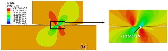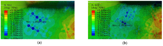 From Figure 13b, we can see the shear stress is randomly appearing inside or on the surface of the material. In Figure 12c, it is also indicated that there will be multiple cracking points appearing on the surface or inside the material because both have roughly the same shear stress. For homogeneous materials, the peak value of shear stress appears on the contact surface. Also, in the left side of the sample below the surface, the shear stress is relatively higher as shown in Figure 10b. So when there are inclusions in the material, the peak value of shear stress is likely to transfer to this area (left side of sample inside). The local inclusion alignment of the stress and peak location of case 3 and case 4 are shown in Figure 14. Therefore, this shows that the inclusion in the high stress region is more likely to cause the transfer of stress peaks from surface to inside the specimen. There is also an effect of mutual coupling between the inclusions. Forming a stress band between the inclusions may directly affect the expansion direction of cracks at a later stage.