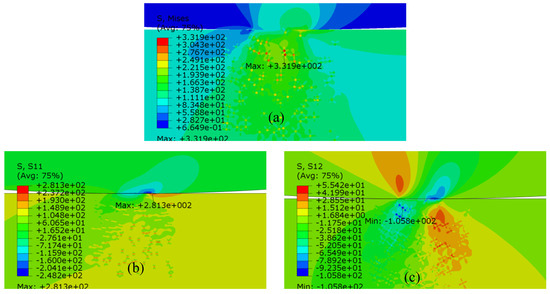 Stress distribution of Case 3 below the contact surface, (a) Mises stress, (b) tensile stress, and (c) shear stress.
