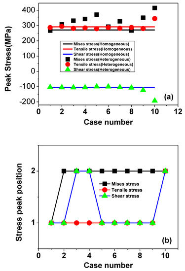 (a) Comparison of stress peaks between heterogeneous materials and homogenous materials, and (b) their location of all cases.